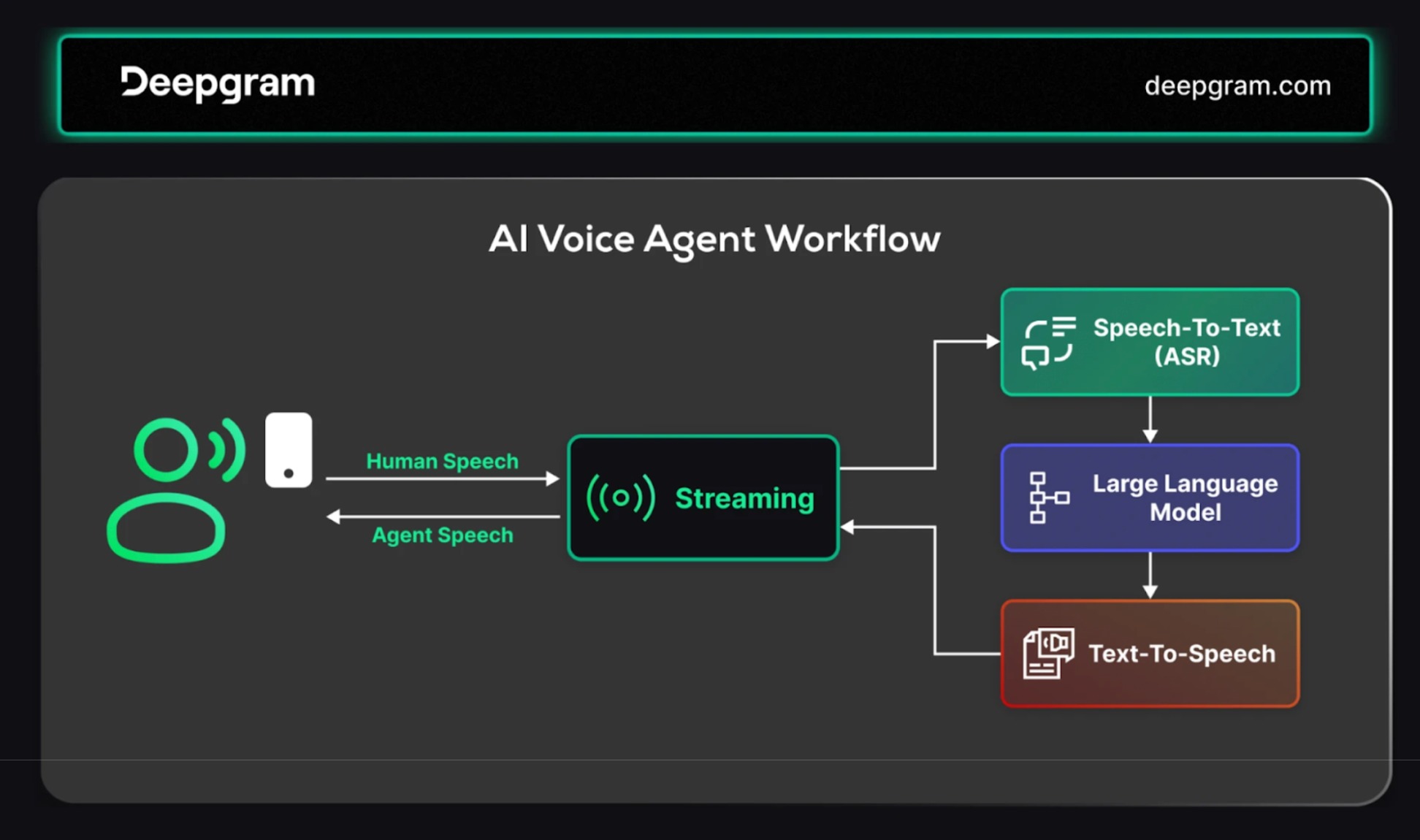 - Use an LLM (Deepgram default or BYO) to reason, call tools, and output actions.