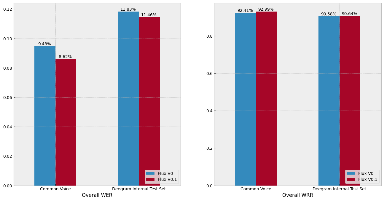 The plots above show finalized transcription accuracy on two test sets, comparing the original version of Flux with this latest update. As you can see, the new version of Flux is modestly more accurate! This was a pleasant surprising in the land of English STT, where we find our models are very close to the accuracy ceiling imposed by ground truth noise (either due to inherent ambiguity in transcription or annotator mistakes).