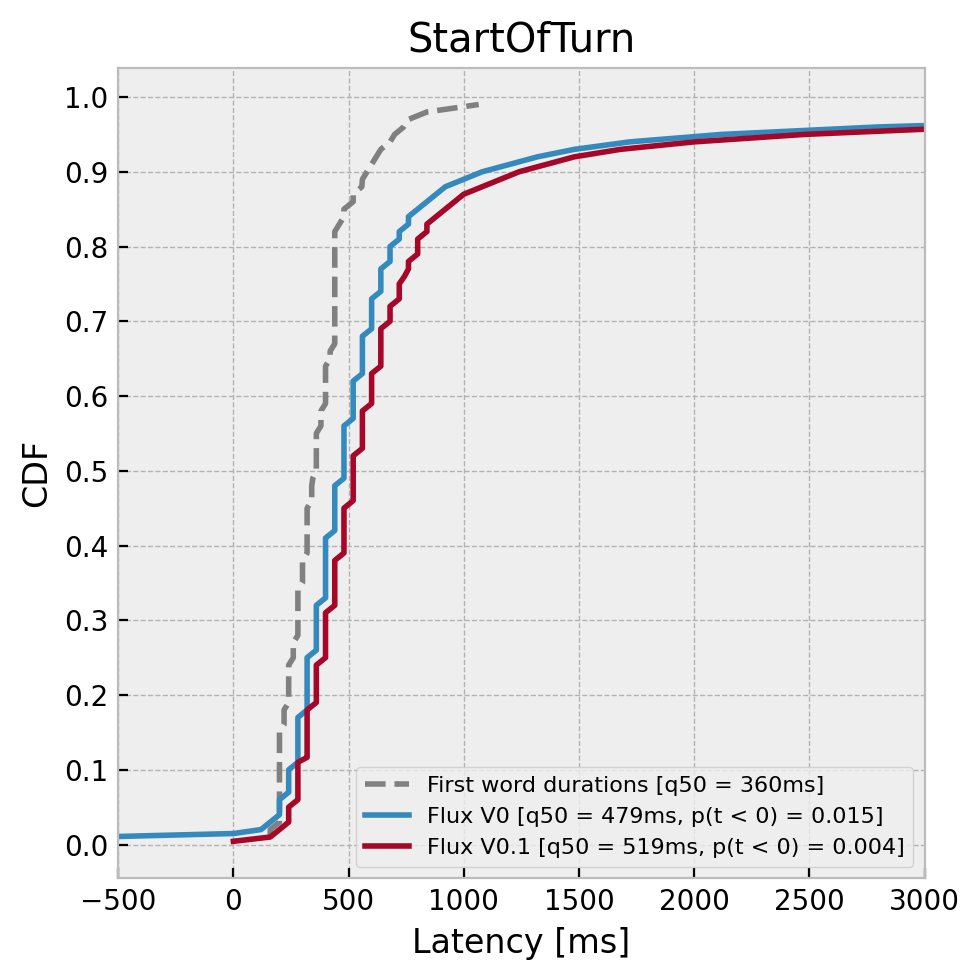 As with most things, this improvement is not entirely free (I was disappointed to find, upon moving into ML in industry, that there is “no free lunch,” especially given free lunch is one of the primary motivators for physics PhD students). Flux V0.1 typically detects start-of-turn ~40ms slower than Flux V0. However, as the CDF of first word durations indicates, both versions still detect turn start within 200ms of when the user actually starts speaking, well within the regime of “normal.”