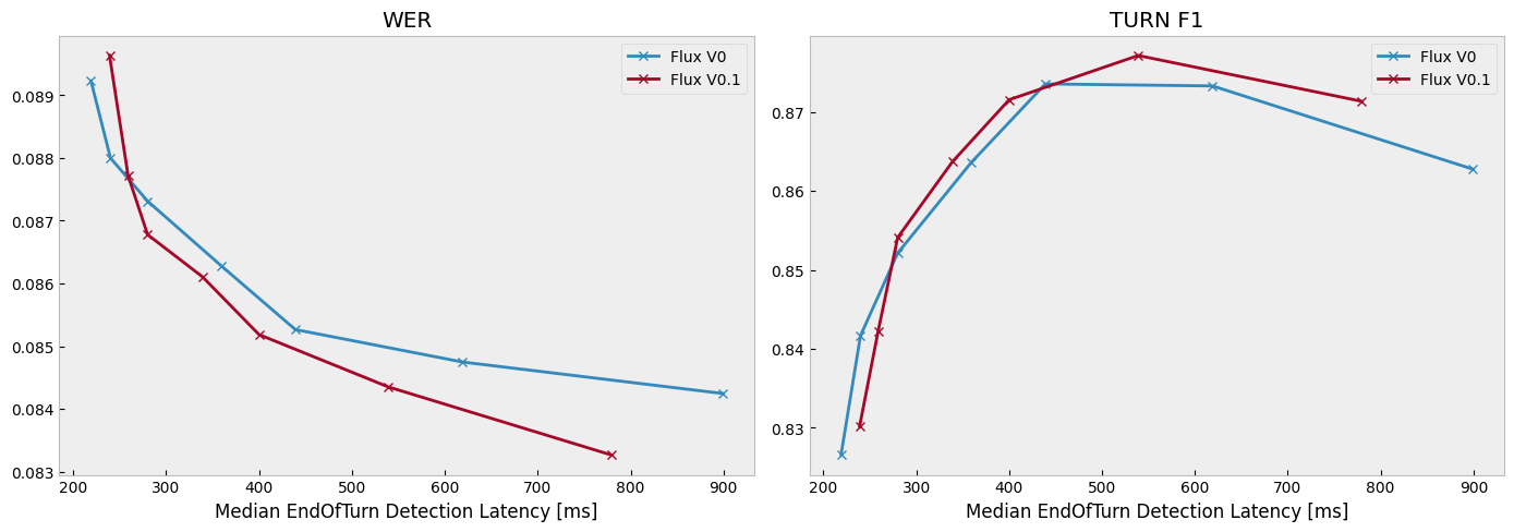 Below, we show the WER and end-of-turn detection F1 score as a function of median detection latency as controlled by eot_threshold (lower threshold = crossed earlier = faster detection, but more false positives). As we can see, the new model behaves almost identically, apart of being slightly faster (and more accurate!) at higher thresholds.